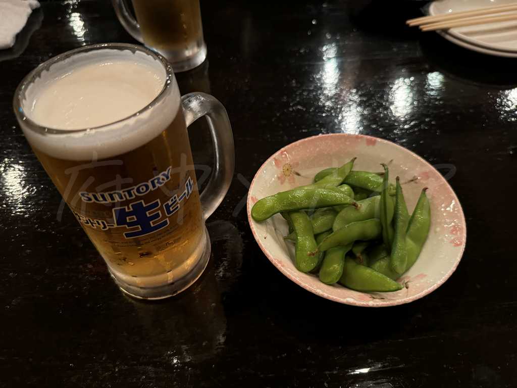 生ビールはサントリー。お通しは定番の枝豆で、まずはビールを飲みながら軽くつまめる、居酒屋らしい安心感のあるスタートです。料理が来るまでの間もゆっくり過ごせます。