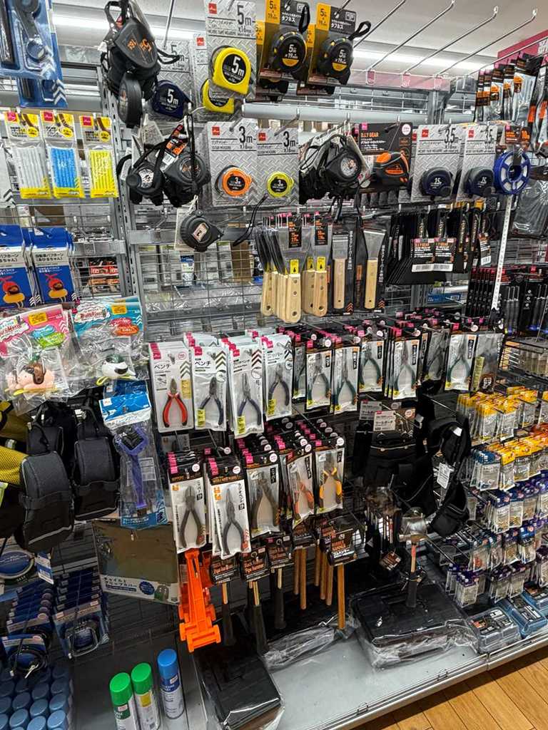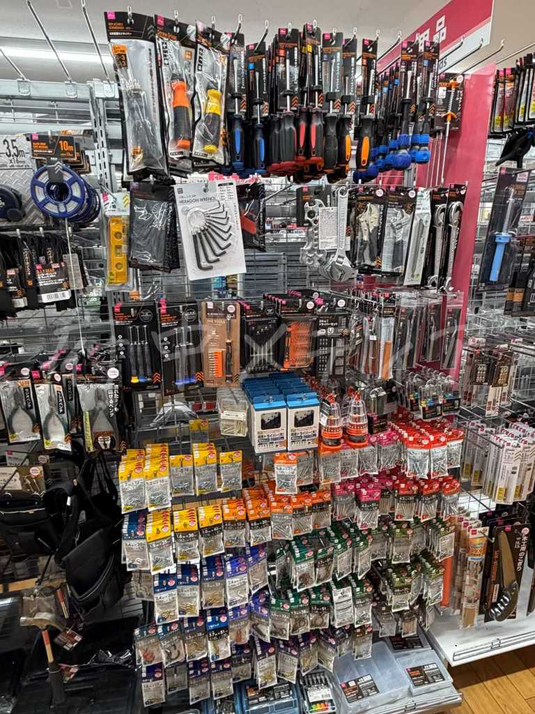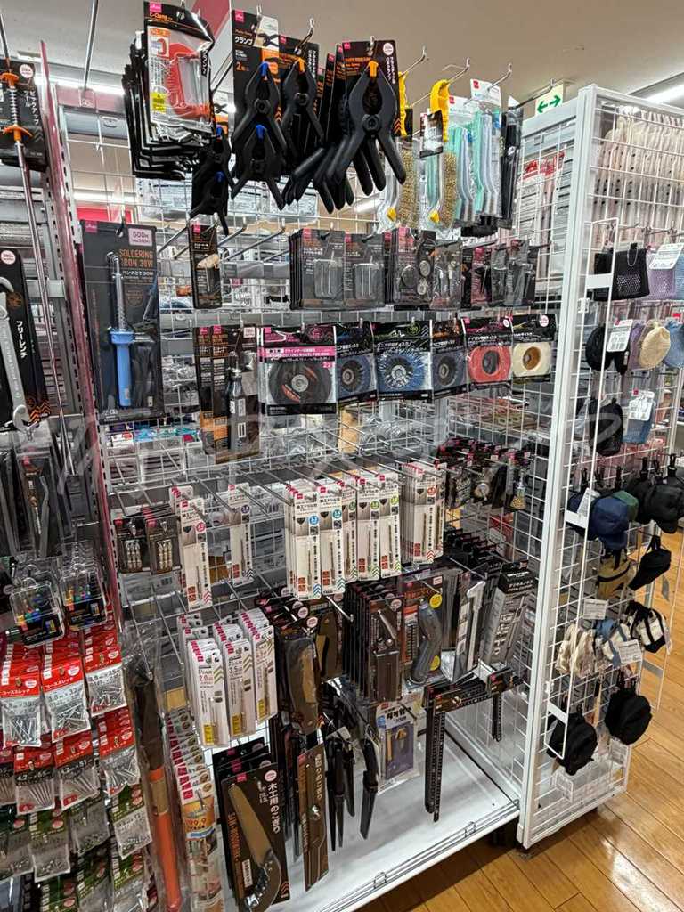 売り場の中央あたりに、工具や小物金具がまとまっています。はじめてのDIYに十分なラインナップです。