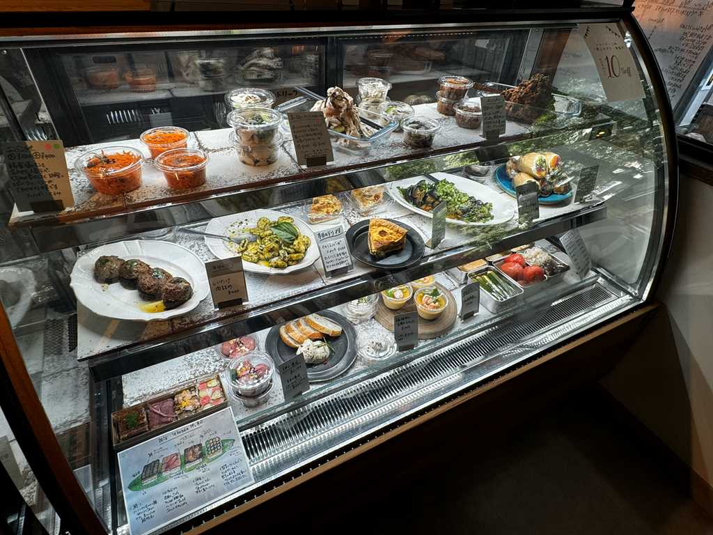 店内のショーケースには、彩り豊かな手作りデリやお惣菜、そして焼き菓子がずらりと並び、どれを選ぶか迷ってしまうほどの充実ぶり。野菜をたっぷり使ったデリや煮込み料理、サラダ系など、家庭ではなかなか作れない手の込んだメニューも気軽に購入できます。
