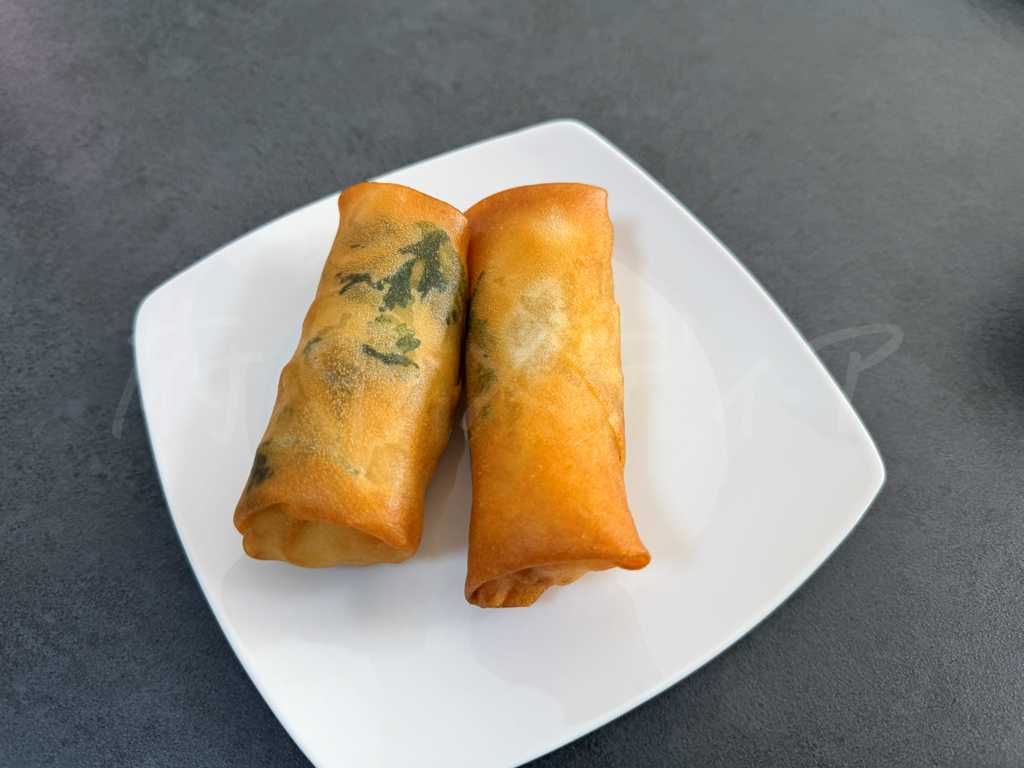 パリッとした春巻きの皮が美味しい海老と蓮根が入った春巻き。
