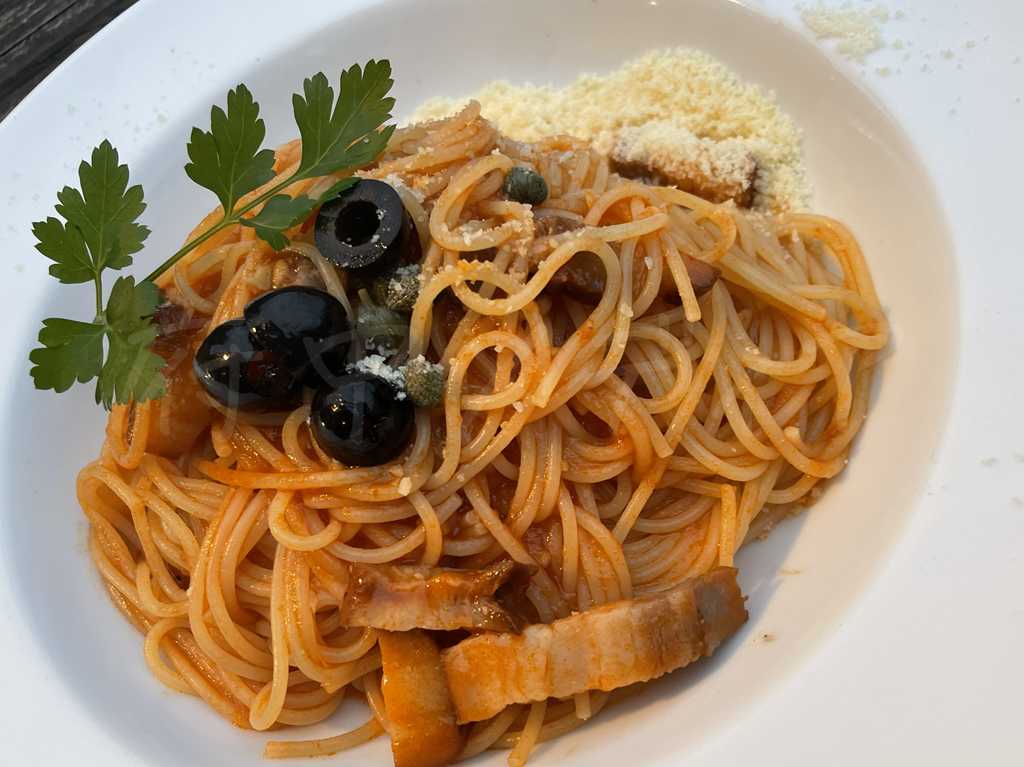 自家製ベーコンの旨みがしっかり感じられるトマトソースパスタで、コクのある味わいが印象的でした。オリーブがほどよいアクセントになっていて、最後まで飽きずに食べられます。トマトの酸味と具材のバランスも良く、満足感のある一皿です。