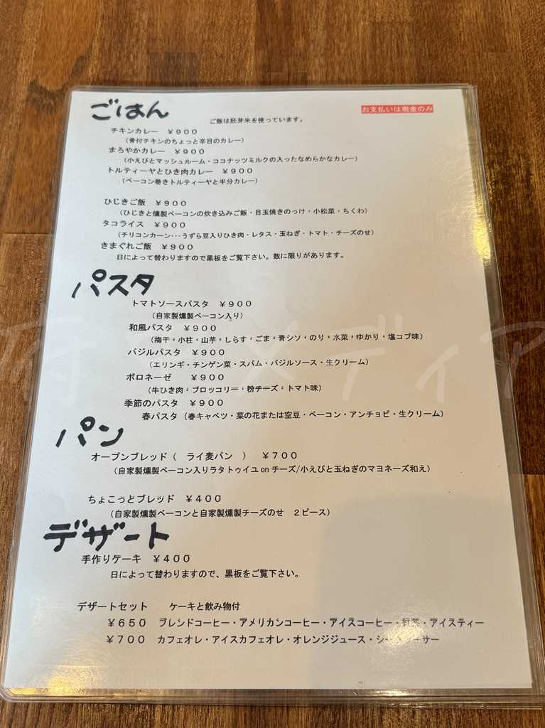 ごはん・パスタ・パン系の食事メニューに加え、デザートまでそろっており、用途にあわせて選びやすいです。価格はごはんやパスタが900円~とお手頃で、しっかり食べたいランチにも、お散歩ついでのカフェ利用にも気軽に立ち寄れます。