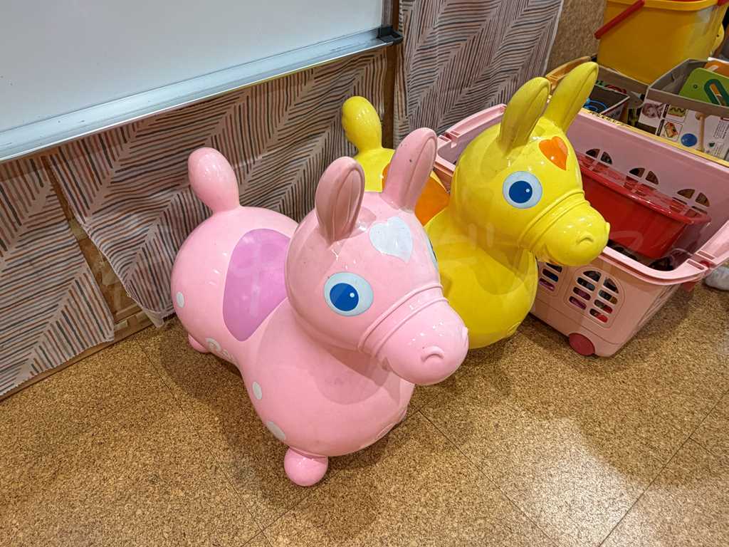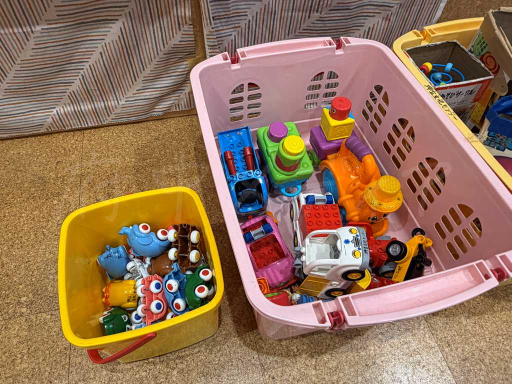 おもちゃの数は多くはなく、シンプルで最低限といった印象です。おままごとなどのごっこ遊び系のおもちゃはなく、0〜2歳頃の子どもが遊びやすいおもちゃが中心。室内にはマットレスが1つ用意されており、ハイハイ期の赤ちゃんが床で遊ぶスペースとしても使えます。