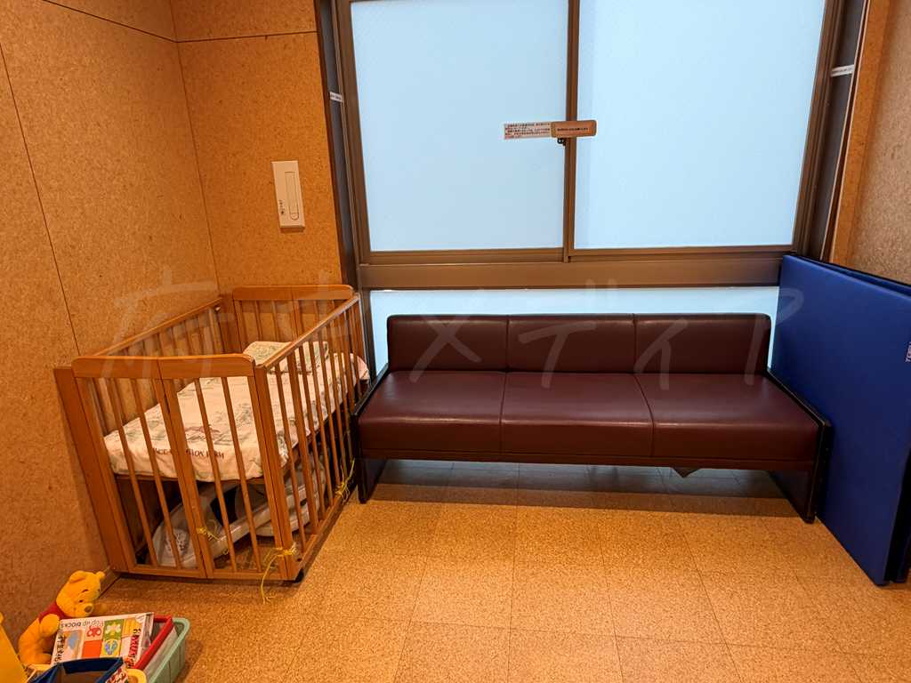 授乳スペースはカーテンで目隠しできますが、カーテン内に椅子がないため床に座って授乳するスタイルです。ソファーは部屋の一番奥にあり、休憩しながら子どもの様子を見守りやすい配置になっています。