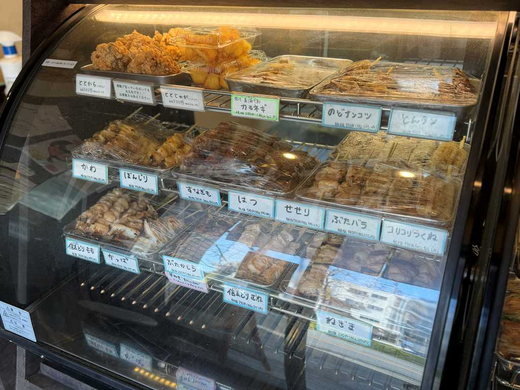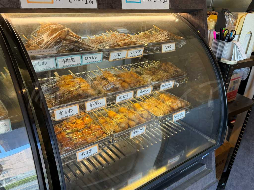 店頭のショーケースには、焼き鳥や串メニュー、唐揚げなどがずらりと並びます。