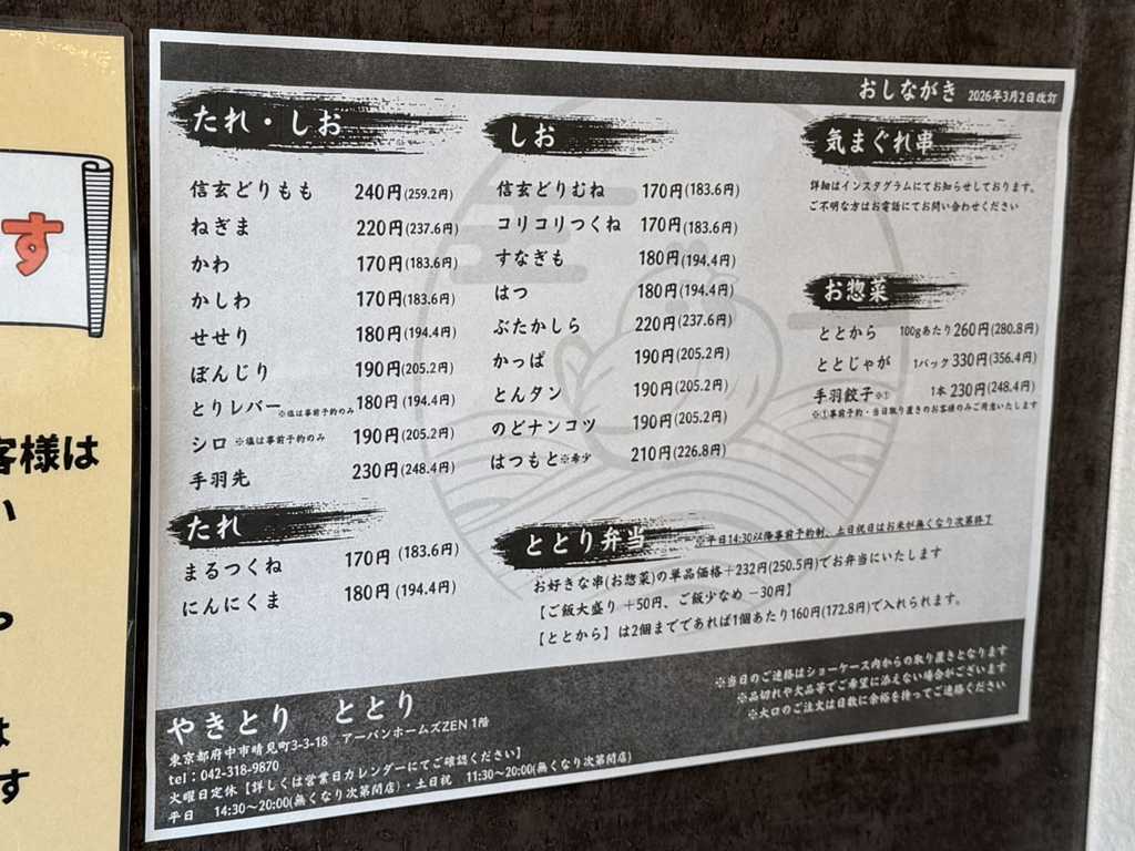 「やきとり ととり」は、北府中駅から徒歩12分、東京農工大学の近くにあるテイクアウト専門の焼き鳥店です。